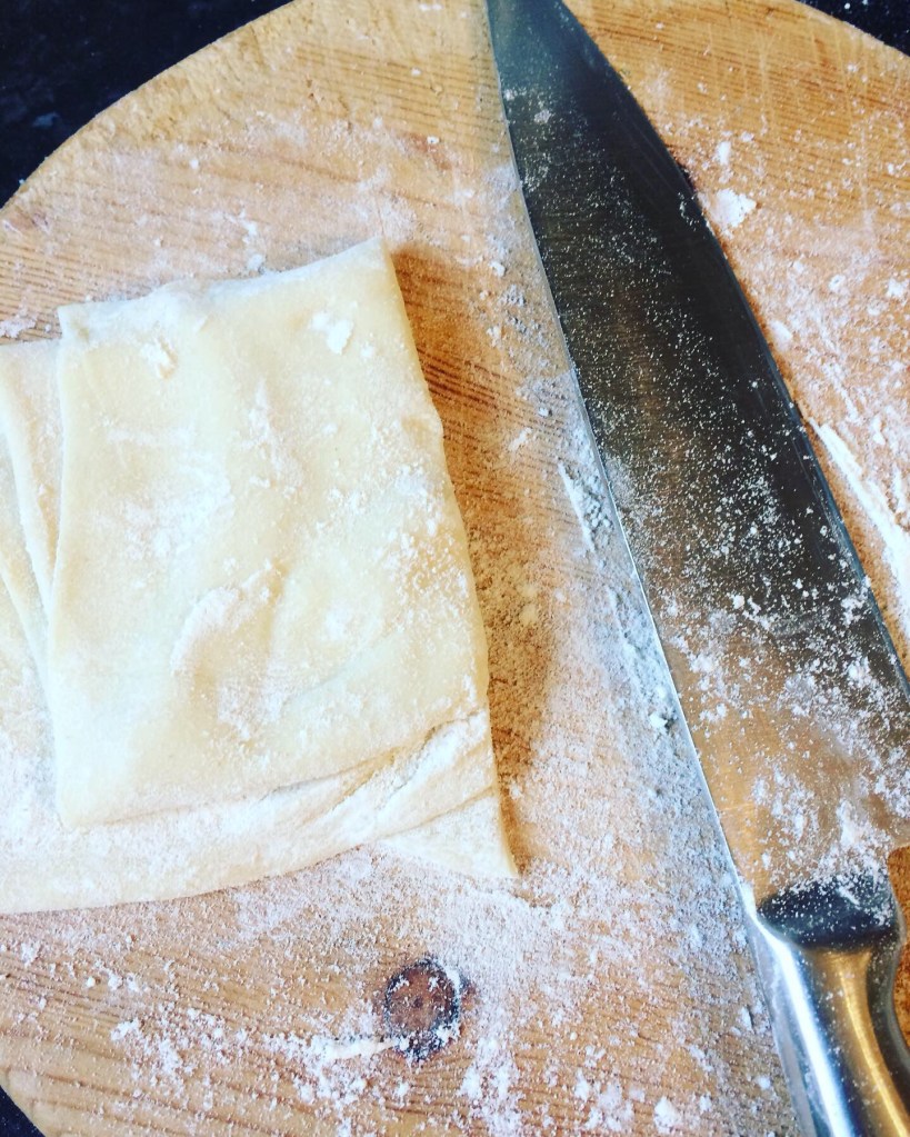6. roll it flat in a rectangular shape to about 2mm (it will become a long strip of dough)